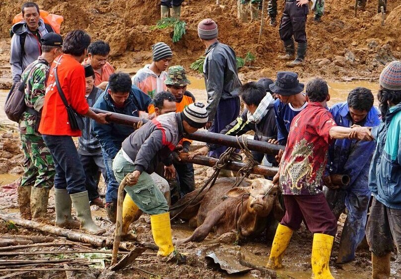 每年11月至次年4月是印尼的雨季,由强降雨和洪水引起的山体滑坡多发。印尼国家抗灾署估计,全国2.5亿人口中,大约一半人居住在山体滑坡易发地区。图为泥石流事故现场。