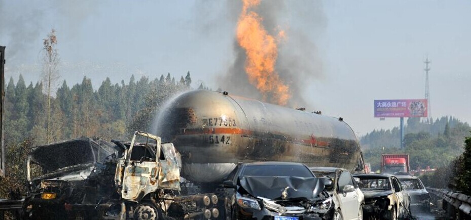 高速路液化气罐车追尾后爆燃 致6死多伤