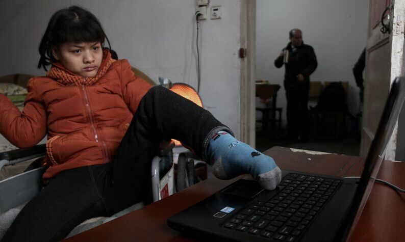 2015年1月20日,安徽省六安市,22岁的脑瘫女孩胡卉媛正在用左脚打字。普通人随随便便可以触摸到的键盘对于她来说太遥远:瞄准—个键,用脚凑近键盘,然后用力“按”下去。