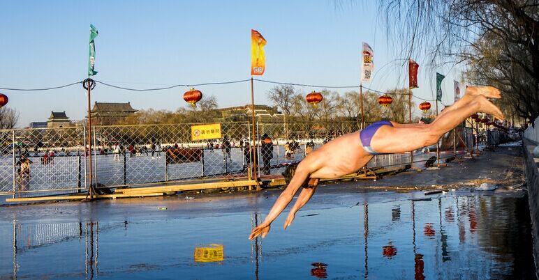 2015年1月27日,北京,什刹海前海冬泳区,几位老人轮番在零下7度的气温下,跃入冰冷的湖水中畅游,使得围观的中外年轻人羡慕不已。前海是北京冬泳爱好者的聚集地,水面早已结上厚厚的冰层,只有一块被凿开的水面。虽然目前是北京最冷的季节,但仍未阻挡这些冬泳老人们的勇气。他们年龄从五十到八十岁之间,男女都有。由于常年坚持冬泳,已经形成固定的生物钟,每天大约有好几拨人。各自一圈,十余成群,相互鼓劲,彼此叫劲。有的还在游完后高声唱歌,引得中外游客纷纷驻足观看、拍照。